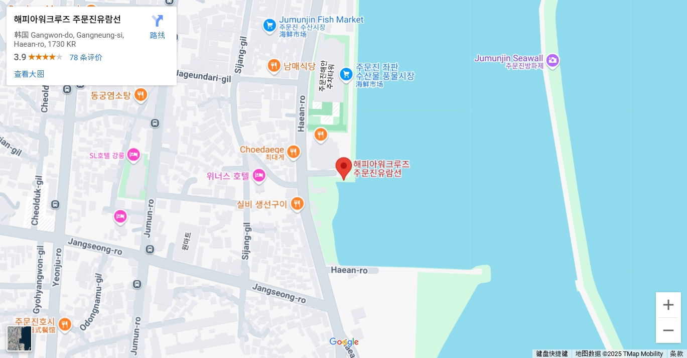 出发地在位于江陵北部的江原道最大渔港注文津港正下方。注文津是韩国各地的人们为购买刚捕捞的新鲜海鲜而蜂拥而至的热门旅游地。这里还因各种电视剧、电影拍摄地而闻名, 拥有海岸城市特有的充满活力的风景。游览船正是从这里出航沿海岸线航行。