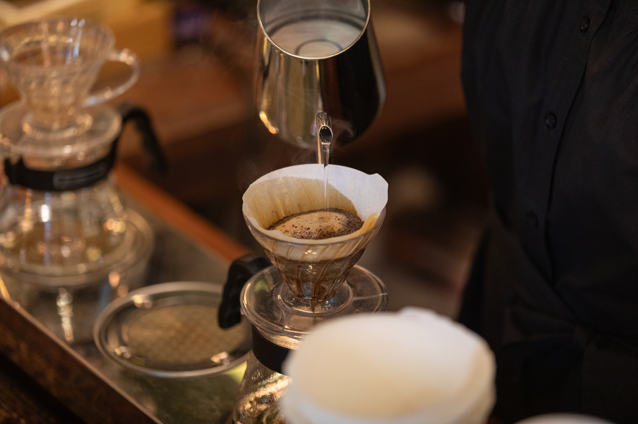 Không gian tại tầng 1 được vận hành như một quán cà phê, bạn có thể trải nghiệm văn hóa cà phê tại nơi đây. Cà phê pha tay kiểu Nhật cho ra nhiều hương vị khác nhau ngay cả khi sử dụng cùng một loại hạt cà phê, tùy thuộc vào mức độ rang, độ xay, nhiệt độ nước, thời gian chiết xuất và tay nghề của người pha. Hãy chọn loại hạt cà phê mà bạn muốn và tự tay pha ra một tách cà phê của riêng mình. Giấy lọc loại bỏ dầu trong cà phê tạo ra hương vị trong và sạch đầy đặc trưng.