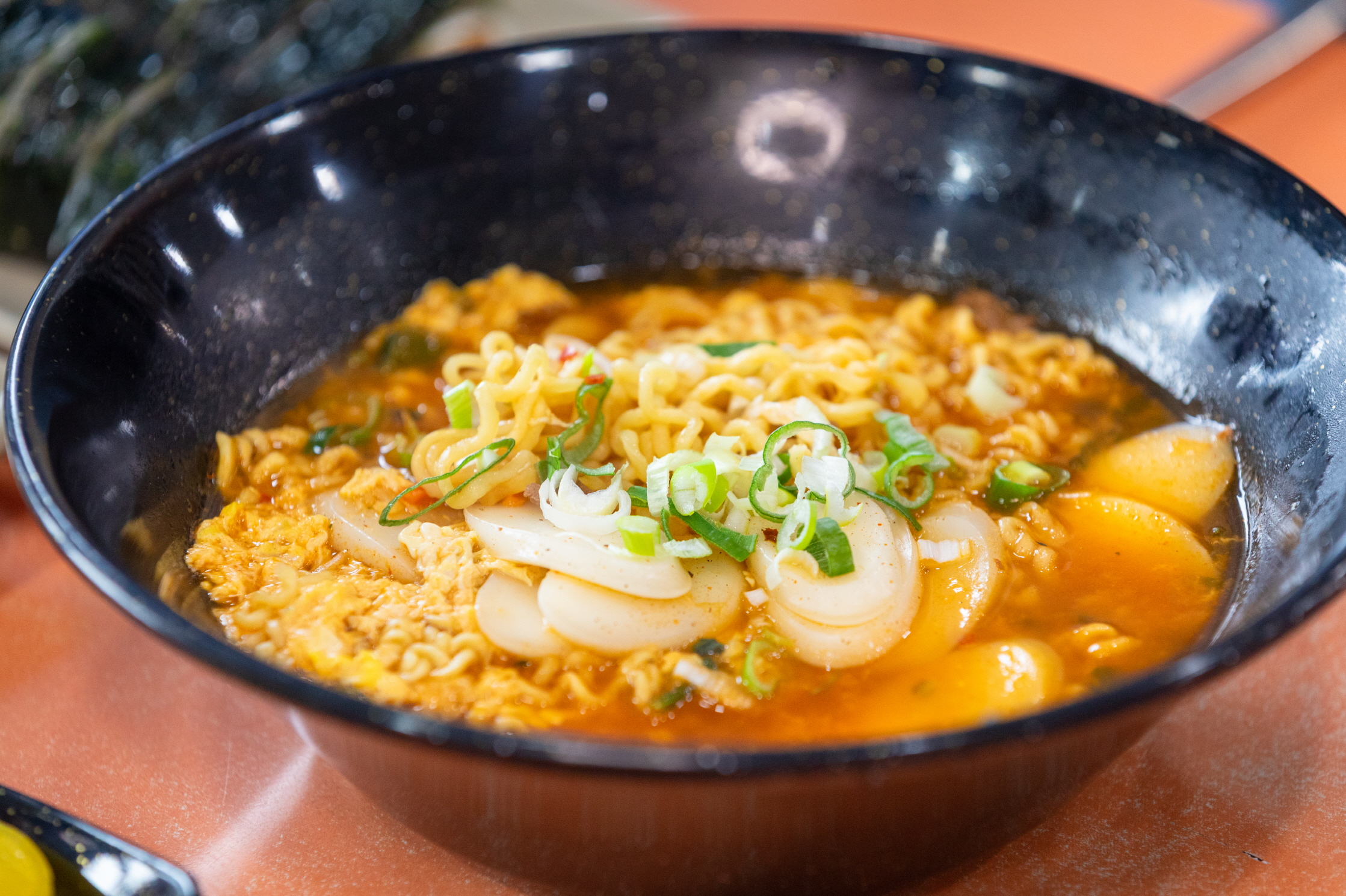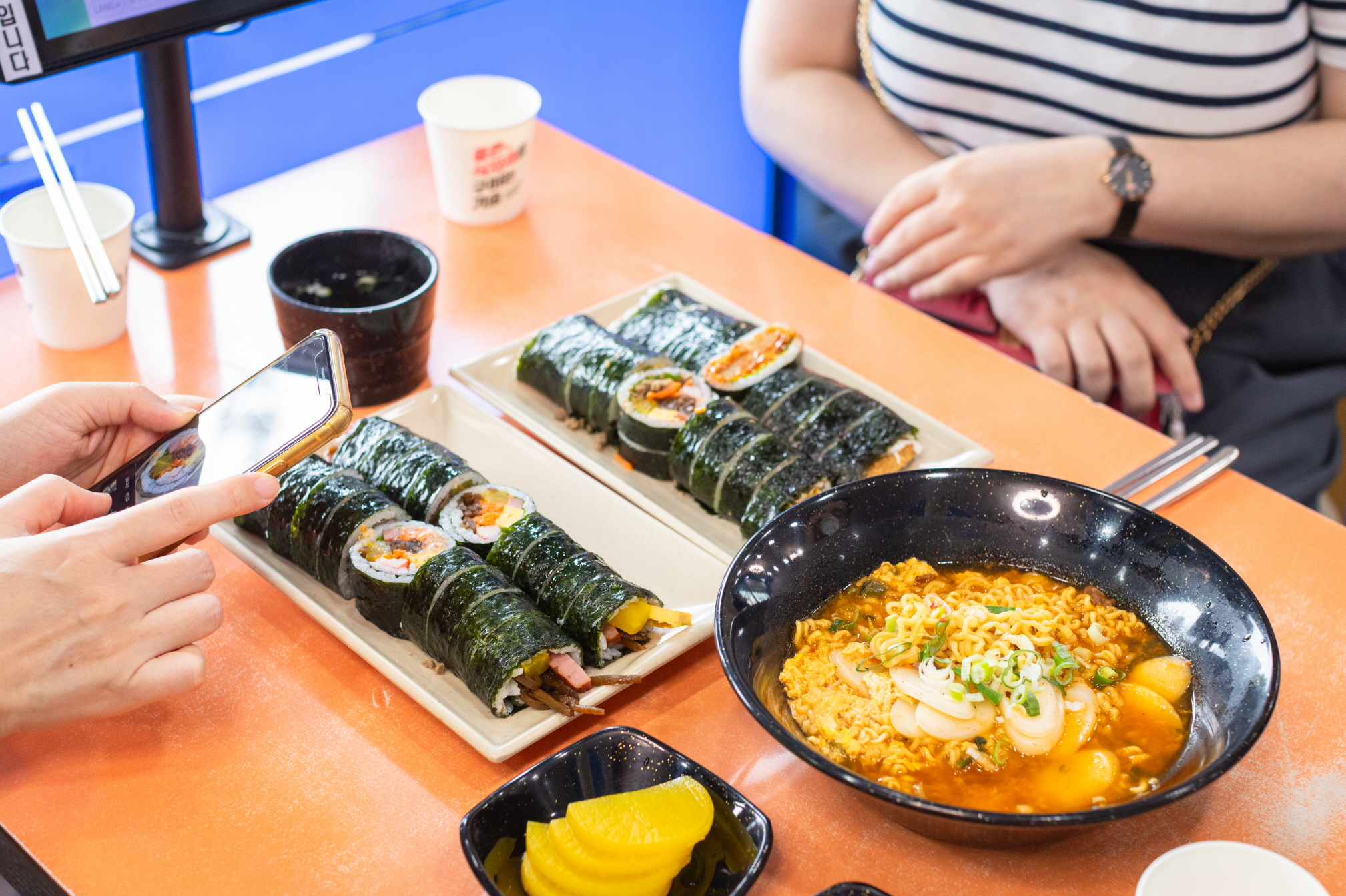 Kimbap là món ăn phổ biến và thân thuộc nhất ở Hàn Quốc. Kimbap cuộn với rong biển bên ngoài, cơm bên trong cùng nhiều nguyên liệu như củ cải muối danmuji, trứng, giăm bông, thanh cua, rau bina, củ ngưu bàng, v.v. hương vị đơn giản nhưng hài hòa nên từ già đến trẻ, nam đến nữ, bất cứ ai cũng có thể thưởng thức một cách thoải mái.