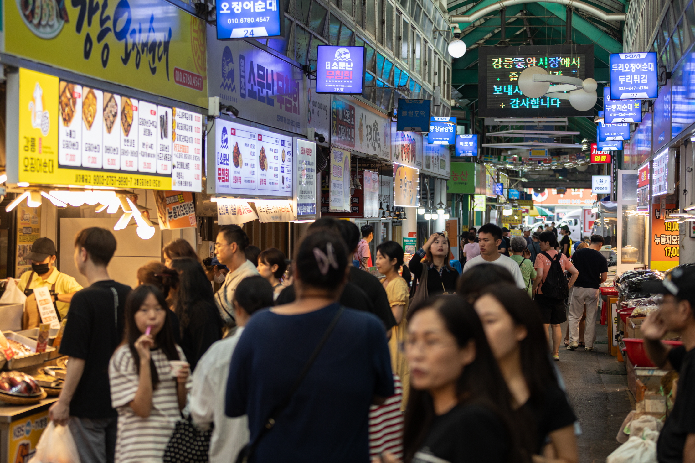 Tự bản thân Chợ trung tâm Gangneung cũng đã là một điểm đến nổi tiếng. Tiếng reo bán hàng đầy sôi động của người bán, dòng người mua qua lại tấp nập, cùng mùi dầu rán thơm phức hòa quyện sẽ khiến bạn phải dừng bước. Thưởng thức các món đồ ăn nhẹ ngay tại chỗ khi đi dạo khu chợ cũng là một niềm vui khác của chuyến du lịch Gangneung.