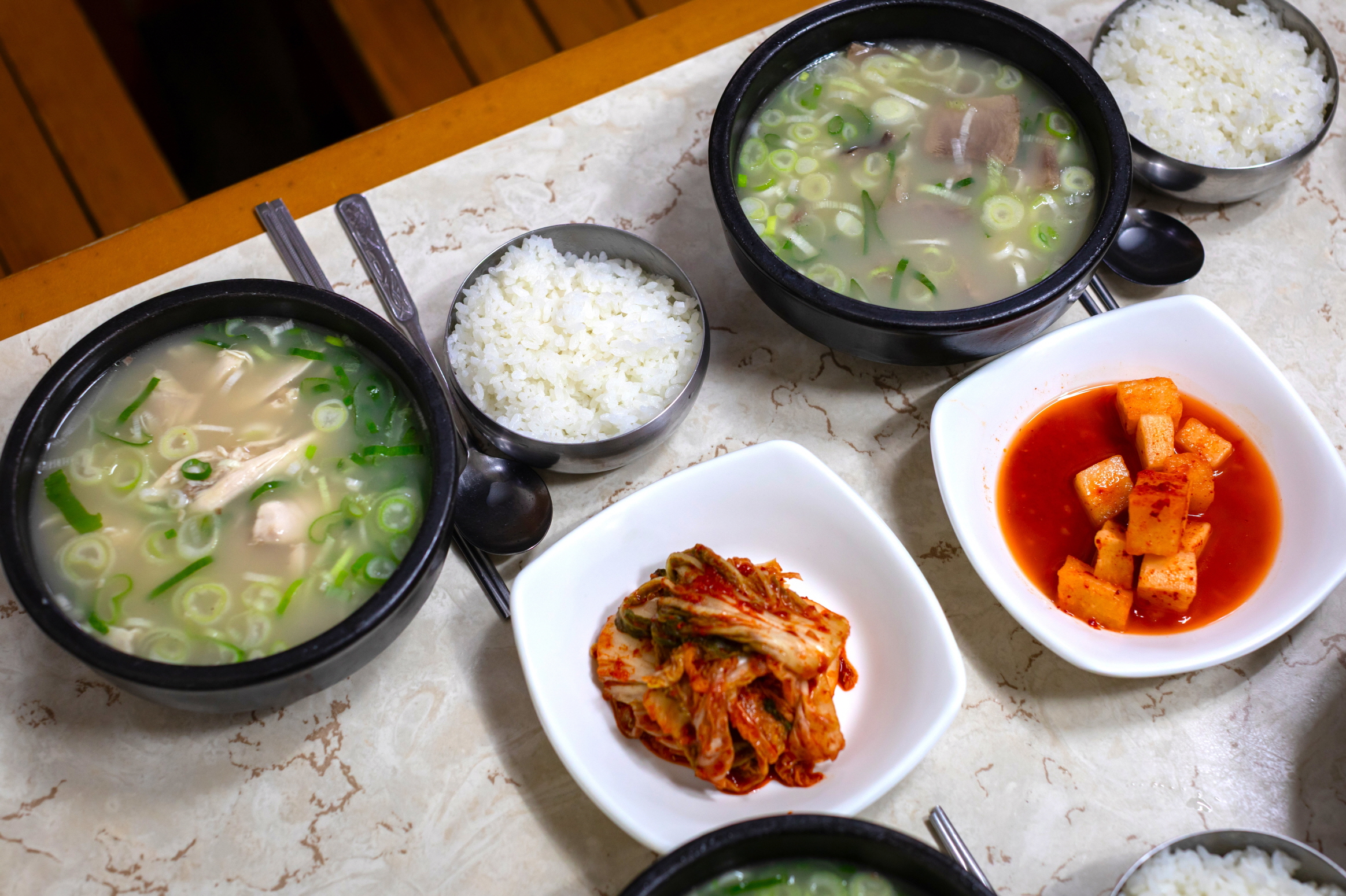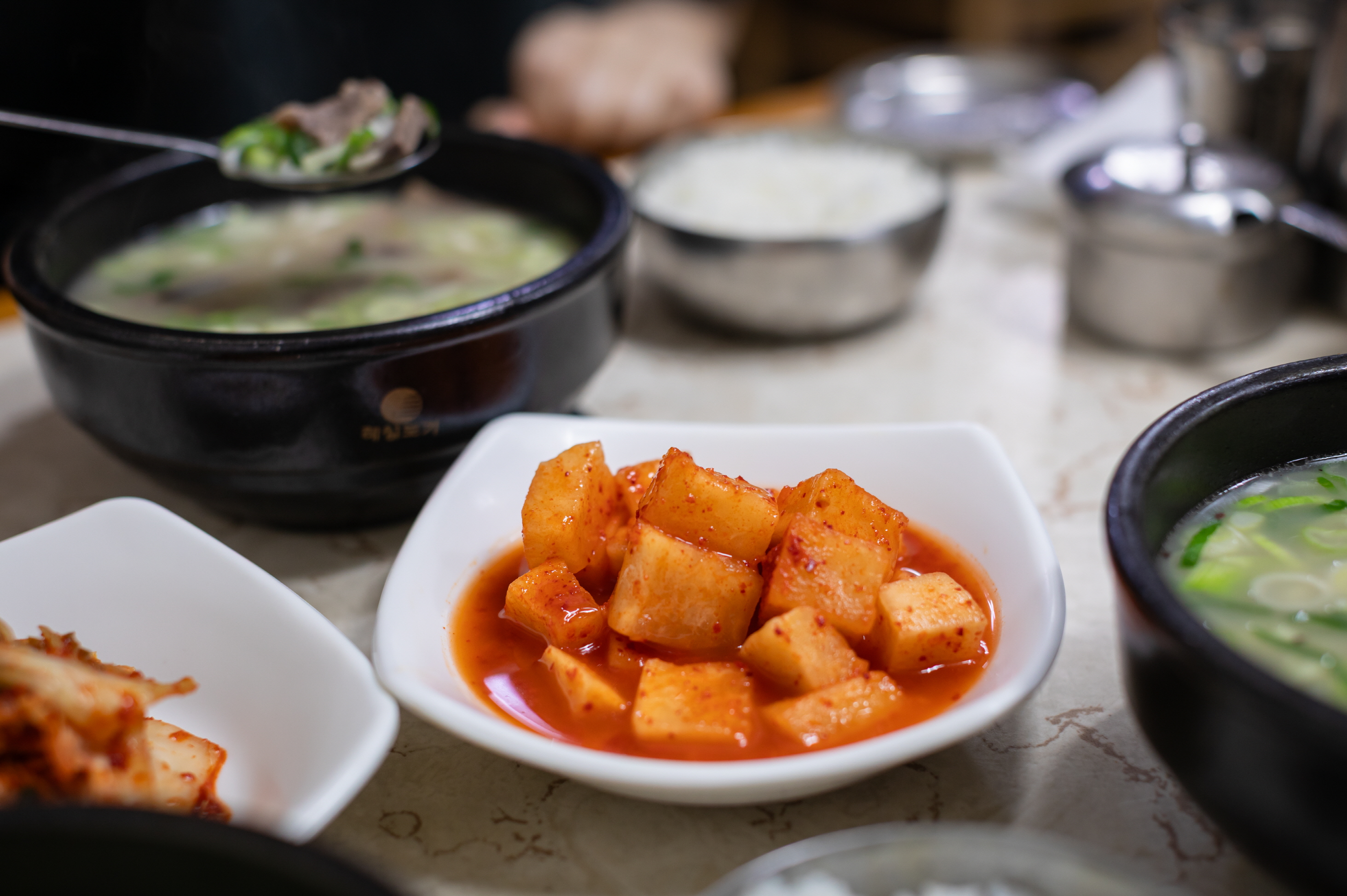 Và một món ăn kèm không thể thiếu chính là kkakdugi (củ cải muối thái hạt lựu). Từng miếng kkakdugi chua ngọt và giòn, đặt lên thìa cơm canh gukbap nóng hổi sau đó cho vào miệng, sự hòa quyện giữa nước dùng, thịt mềm thơm và kimchi tạo nên một hương vị hoàn hảo. Hầu hết các quán gukbap đều phục vụ kimchi và kkakdugi không giới hạn, vì vậy chỉ với một bát gukbap, bạn cũng có thể tận hưởng một bữa ăn no bụng và hạnh phúc.