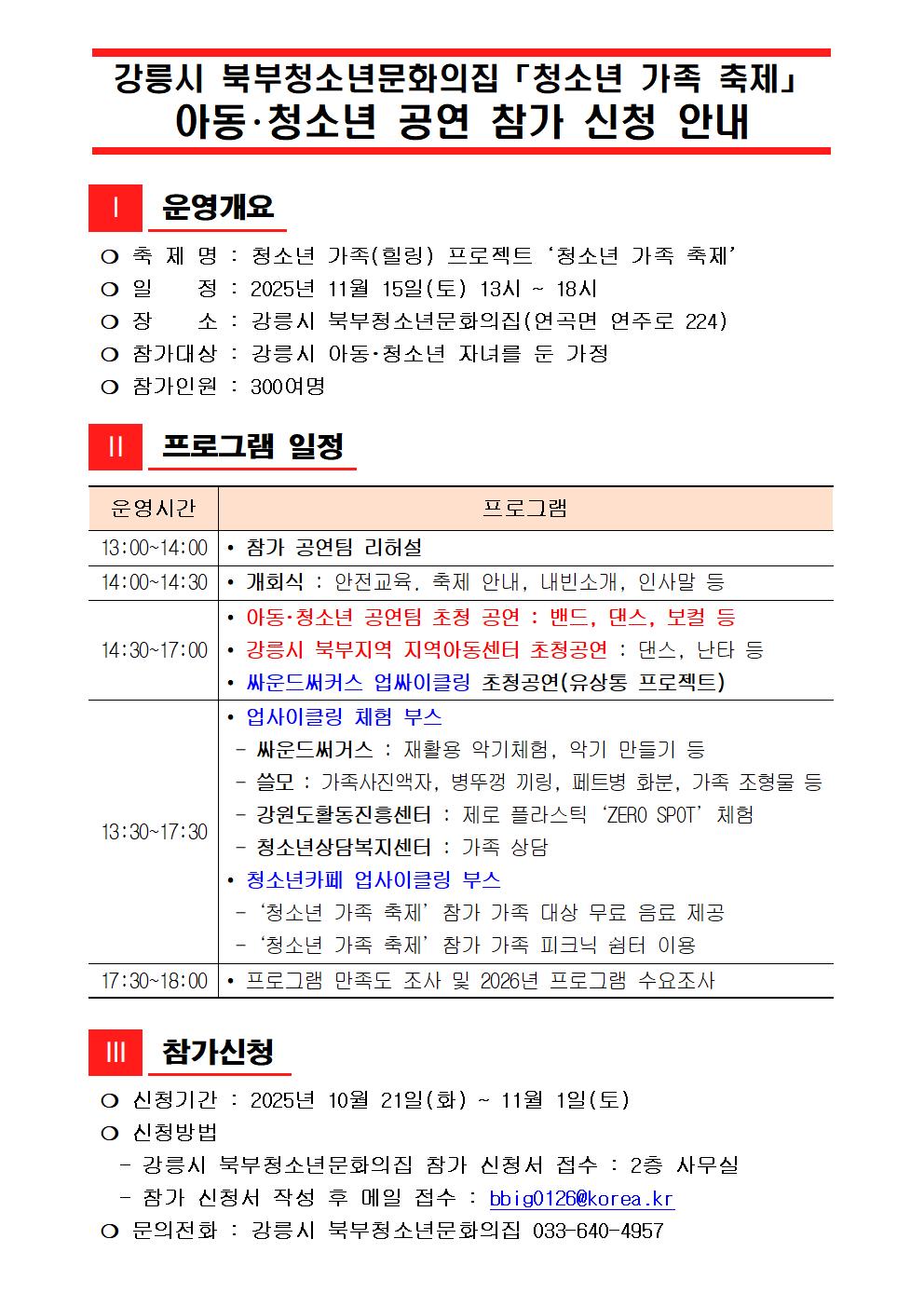 제목 | 강릉시 북부청소년문화의집「청소년 가족 축제」 아동・청소년 공연 참가 신청 안내 |