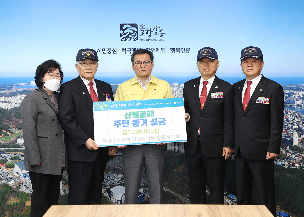 작성일 2023.04.25, 조회수 1531 강릉 산불 피해복구 성금기탁(무궁수훈자회 강원도지부 강릉시지회) 사진 확대보기 이전 이미지 보기 다음 이미지 보기 이전 썸네일 보기 다음 썸네일 보기 무궁수훈자회 강원도지부 강릉시지회는 25일 강릉시청을 방문해 산불 피해복구 성금1,000만원을 기탁했다. 목록