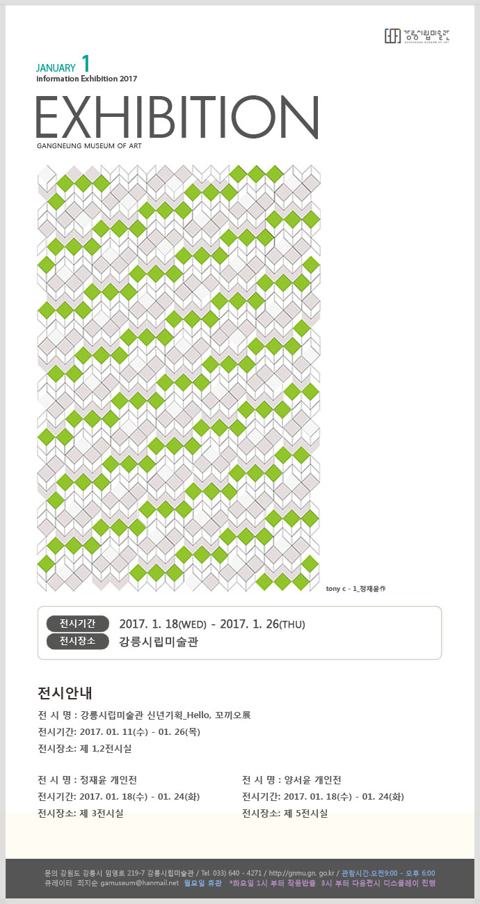 미술관 소식 홈 소식 미술관 소식 미술관 소식 공유하기 페이스북 트위터 블로그 인쇄 홈 소식 미술관 소식 작성일 2017.01.17, 조회수 536 소식_미술관소식 상세보기 - 제목, 작성자, 내용, 파일 정보 제공 제목 1월 셋째주 전시안내 작성자 강릉시립미술관 내용 자세한 내용은 첨부파일의 이미지를 확인해주세요. 사진 확대보기 파일 1.jpg 다운로드 미리보기 목록 이전글 2017년 1월 전시연계프로그램 신청안내 다음글 휴관안내