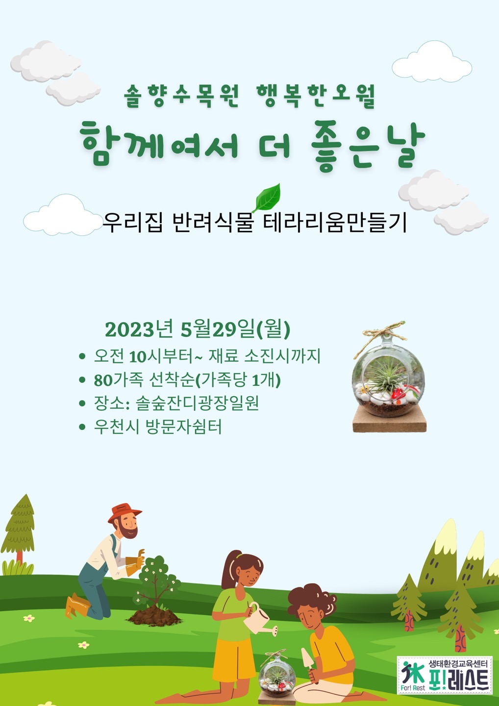 5월 가정의 달을 기념하여 5월 29일(월) 가족행사를 진행하고자합니다. 오전 10시부터 솔숲잔디광장 일원에서 진행되며, 주어진 미션을 완료하시는 가족분들께 반려식물 테라리움 키트를 드립니다.(가족당 1개) 많은 참여 부탁드립니다. |