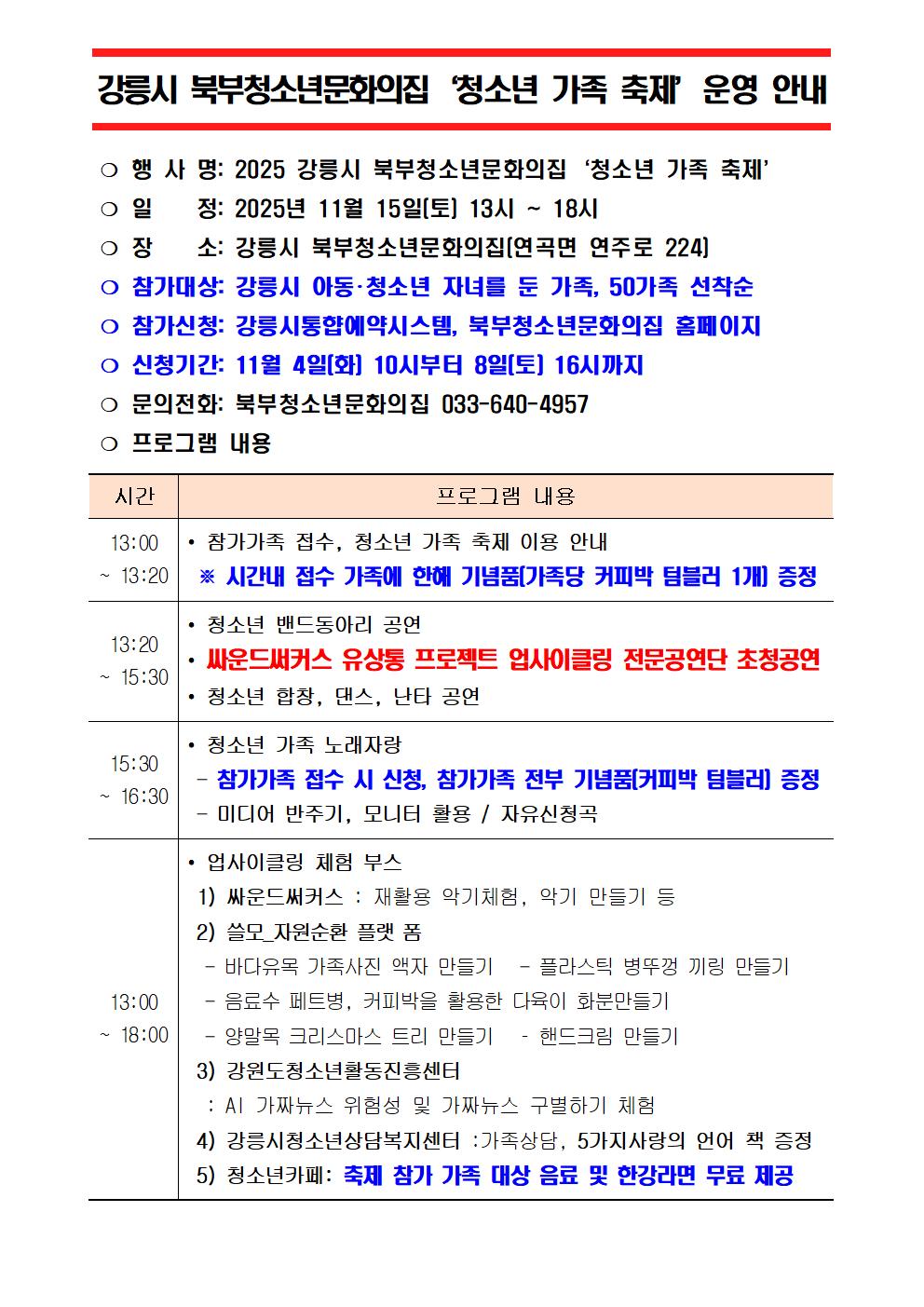 | 내용 | 북부청소년문화의집 '청소년 가족 축제' 참가 가족 추가 모집 안내 |