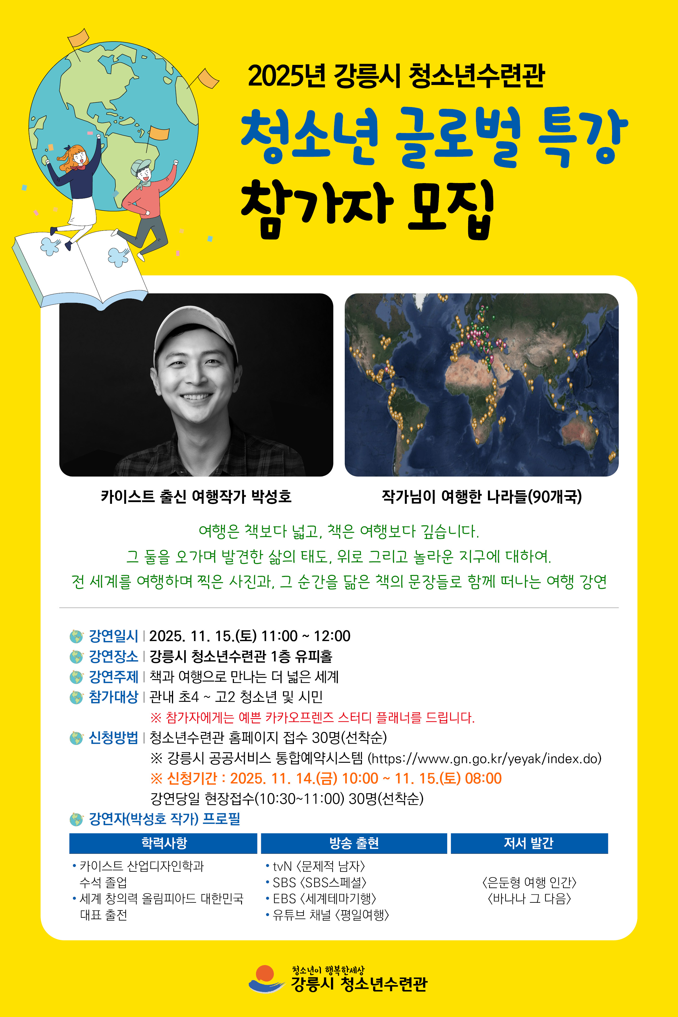 그 둘을 오가며 발견한 삶의 태도, 위로 그리고 놀라운 지구에 대하여. 전 세계를 여행하며 찍은 사진과, 그 순간을 닮은 책의 문장들로 함께 떠나는 여행 강연 ○ 강연일시 : 2025. 11. 15.(토) 11:00 ~ 12:00 ○ 강연장소 : 강릉시 청소년수련관 1층 유피홀 ○ 강연주제 : 책과 여행으로 만나는 더 넓은 세계 ○ 참가대상 : 관내 초4 ~ 고2 청소년 및 시민 ※ 참가자에게는 예쁜 카카오프렌즈 스터디 플래너를 드립니다. ○ 신청방법 : 청소년수련관 홈페이지 접수 30명(선착순) ※강릉시 공공서비스 통합예약시스템 (https://www.gn.go.kr/yeyak/index.do) ※ 신청기간 : 2025. 11. 14.(금) 10:00 ~ 11. 15.(토) 08:00 강연당일 현장접수(10:30~11:00) 30명(선착순) |